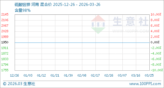 3月26日,生意社硫酸铝钾基准价为1950.00元/吨,与本月初持平。