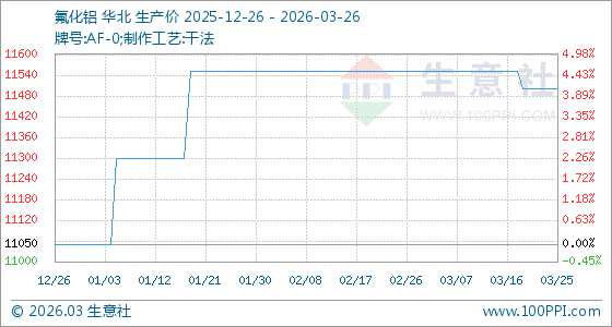 3月26日,生意社氟化铝基准价为11500.00元/吨,与本月初(11550.00元/吨)相比,下降了0.43%。