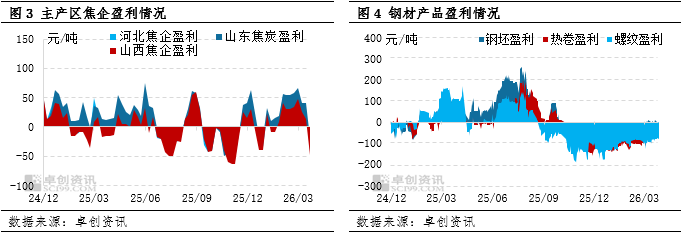 3月初因钢厂高炉铁水下滑明显,钢铁(850106)需求偏弱,焦炭供应过剩矛盾凸显,且焦煤价格偏弱,焦炭价格下调一轮,降幅50-55元/吨。本月因钢厂供应减量,钢材价格偏强运行,中旬后焦炭价格止跌企稳,焦煤、钢材价格整体共振偏强上涨,钢厂盈利有所修复。截至3月26日,卓创资讯(301299)监测的河北唐山钢坯盈利-1元/吨,较2月末减亏32元/吨,本月平均盈利-7.53元/吨,较上月减亏40.12元/吨。另外3月份河北地区热卷盈利-75.45元/吨,较上月减亏33.04元/吨。整体看3月份钢厂盈利情况有所修复,但利润率仍然不高,盈利维持偏低水平。