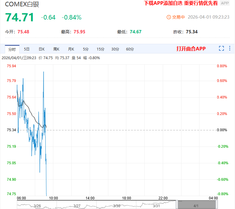 截止今日发稿,现货白银报74.71美元/盎司,跌幅0.84%。