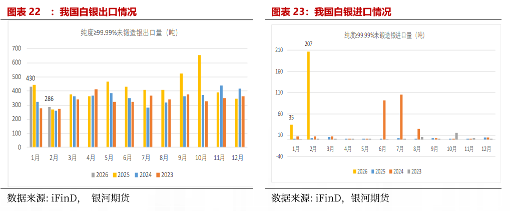 从基本面(工业属性)看,白银又不只是黄金的“影子资产”。此前白银之所以能够在金价走强的同时走出过一段独立行情,很大程度上源于其自身供需矛盾在过去一段时间持续积累:全球白银市场已连续多年处于供不应求状态,世界白银协会在最新的2月展望中预计2026年仍将录得约6700万盎司(约2084吨)的供需缺口,为连续第六年出现年度短缺,并明确指出市场仍将继续依赖地上库存的释放来弥补缺口。与此同时,库存层面的紧缺格局也没有因为银价的下跌得到根本逆转,LBMA披露伦敦仓库截至2月底的白银库存较前月下降至27065吨(环比减少2.4%),COMEX的白银库存到3月底也回落至约10189吨(环比减少9%),而国内上期所、上金所的白银库存截至3月底仅675吨(环比减少10%)。另外,值得注意的是,由于今年年初,我国白银的进口窗口罕见地长时间打开,1-2月我国的99.99%纯度的银锭进口数量达到242吨(这一月度进口数据通常情况下只有个位数),作为白银消费(883434)大国,我国约80%的白银被用于实际的工业领域,虹吸进入国内的白银并未进入交易所库存,更多地被市场直接消化,叠加国内白银现货升水价格仍暂未回到历史正常水平,表明真实的白银现货需求总体仍然旺盛。也就是说,即使近期由于资金抽离、流动性收紧等原因带来银价的下行,但真正能够灵活进入现货流通体系、缓解挤仓与升水压力的“自由库存”并没有明显宽松,因此需求偏紧的基本格局暂时仍未被打破。