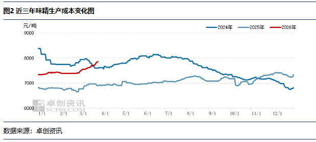 味精属于农产品(850200)深加工产品,生产成本高度依赖原料及能源(850101)价格,3月份涨价的核心驱动力正是上游成本的持续攀升。2025年四季度以来,受基层售粮进度偏慢、贸易商囤货惜售、深加工企业需求回暖影响,国内玉米(885811)价格持续走高,直接推高味精原料成本。除玉米(885811)外,液氨、硫酸等辅料(884131)价格同步上涨,液氨市场受春季检修、下游磷复肥行业需求旺盛影响,价格震荡上扬;动力煤整体价格处于高位,截至3月30日,动力煤Q5500市场均价在552.5元/吨,较2026年初上涨5.24%。而作为生产辅料(884131)的硫酸,价格更是不断创新高,3月30日全国均价在1619.06元/吨,月同比上涨106.12%,较2026年初上涨54.2%。生产端能源(850101)成本居高不下,多重原料叠加施压,让味精企业生产成本较前期明显增加。根据卓创资讯(301299)数据,2026年3月底味精行业平均生产成本提升至7800元/吨以上,月环比增幅6.13%。原料成本的刚性上涨,成为推动味精涨价的最直接因素。