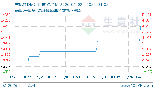 据生意社监测,有机硅(884211)DMC04月02日最新价格14300.00元/吨,最近60天上涨3.25%,90天上涨4.95%。