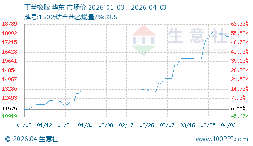 据生意社监测,丁苯橡胶04月03日最新价格17766.67元/吨,最近20天上涨12.09%,30天上涨29.21%,60天上涨35.45%,90天上涨53.49%。