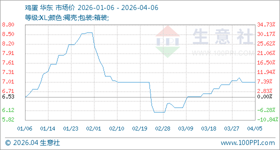 4月6日,生意社鸡蛋基准价为7.00元/公斤,与本月初持平。