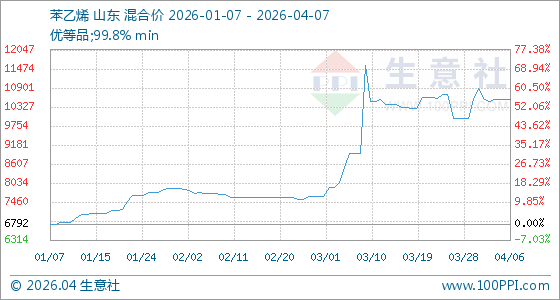 4月7日,生意社苯乙烯基准价为10540.00元/吨,与本月初(10890.00元/吨)相比,下降了3.21%。
