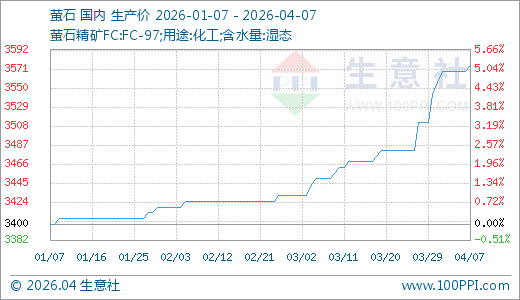 04月07日萤石3575.00元/吨 30天上涨3.62%