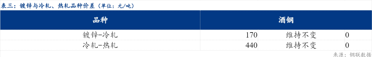 价差方面看,今日兰州与西安市场价差维持不变、与安阳市场价差正向扩大10元/吨、与天津市场价差维持不变、与乌鲁木齐市场价差维持不变。品种价差看,今日镀冷价差维持不变,冷热价差维持不变。