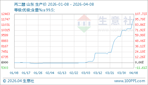 丙二醇04月08日最新价格11866.67元/吨,最近5天上涨12.66%,10天上涨24.91%,20天上涨65.97%,30天上涨83.03%,60天上涨99.44%。