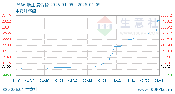 4月9日,生意社PA66基准价为22966.67元/吨,与本月初(20866.67元/吨)相比,上涨了10.06%。