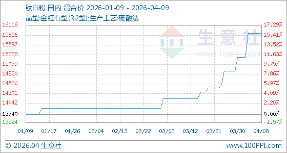 4月9日,生意社钛白粉(884209)基准价为15900.00元/吨,与本月初(15260.00元/吨)相比,上涨了4.19%。