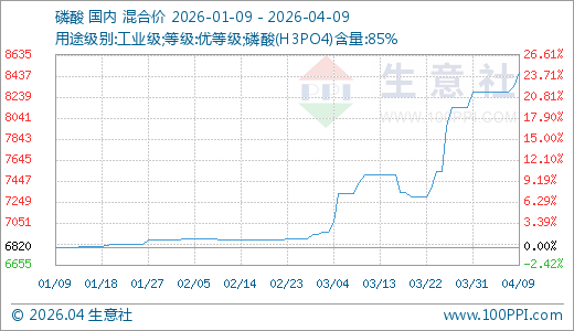 磷酸04月09日最新价格8470.00元/吨,最近10天上涨4.09%,20天上涨16.03%,60天上涨22.75%,90天上涨24.19%。