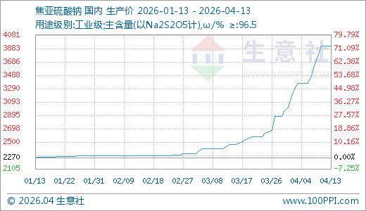 04月13日焦亚硫酸钠3916.67元/吨 5天上涨7.80%