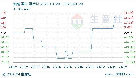 据生意社监测,盐酸04月20日最新价格120.00元/吨,最近10天上涨11.63%,30天上涨45.45%。