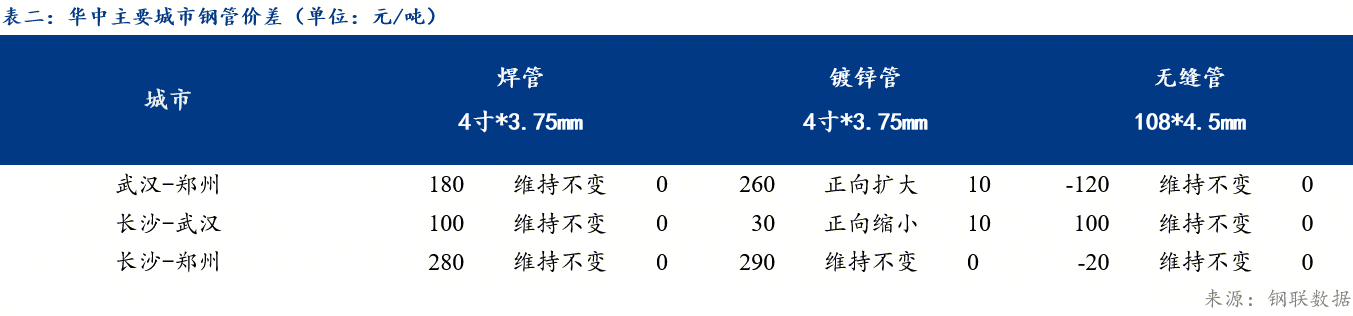 今日价差,焊管、镀锌管方面,武汉与郑州市场镀锌管价差扩大10元/吨,长沙与武汉市场镀锌管价差缩小10元/吨,华中区域其他市场焊管、镀锌管价差均维持不变;无缝管方面,华中市场无缝管价差均维持不变。