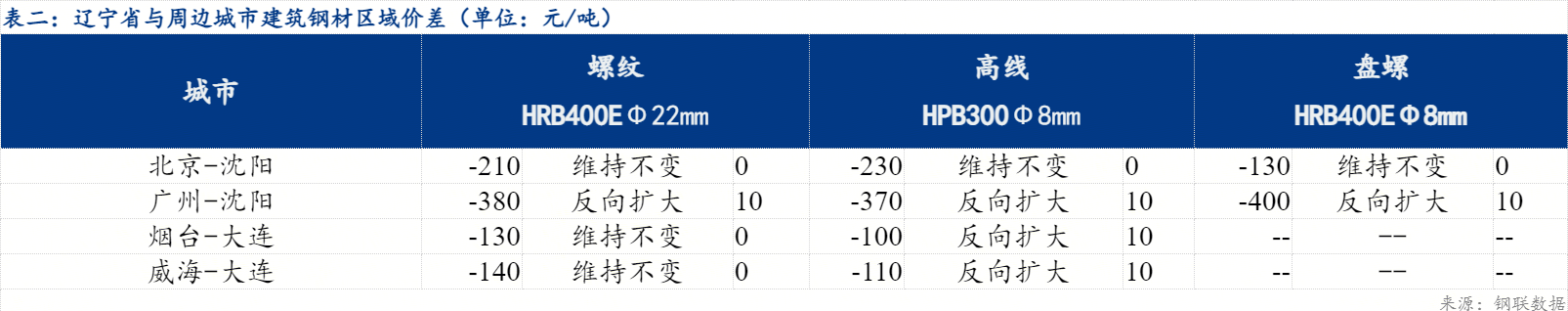 今日北京与沈阳价差维持不变 ,广州与沈阳价差反向扩大10元/吨,烟台与大连价差维持不变 ,威海与大连价差维持不变 ,整体来看,今日辽宁省内现货资源流向北京略有亏损。