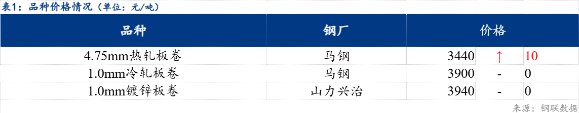 今日合肥镀锌及冷轧板卷价格持稳。价格方面:冷轧板卷价格较上一交易日持平 ,1.0mm马钢价格3900元/吨;镀锌板卷价格较上一交易日持平 ,1.0mm山力兴治价格3940元/吨。市场方面,今日热卷期货盘面冲高回落,冷镀板卷现货市场早盘商家报价持稳观望,盘中下游询盘尚可,市场流转需求较少,但随着盘面回落终端压价明显,全天成交一般。