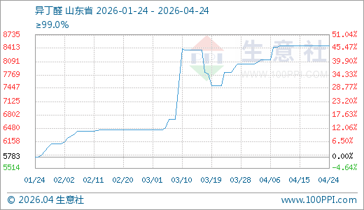 异丁醛04月24日最新价格8466.67元/吨,最近20天上涨4.10%,30天上涨8.09%,60天上涨31.61%,90天上涨46.40%。