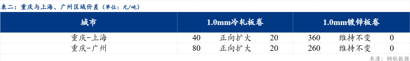 重庆、上海地区冷轧板卷区域价差正向扩大20元/吨;重庆、广州冷轧板卷区域价差正向扩大20元/吨。重庆、上海镀锌板卷区域价差维持不变0元/吨;重庆、广州镀锌板卷区域价差维持不变0元/吨。镀锌、冷轧品种价差正向缩小20元/吨;镀锌、热轧品种价差维持不变0元/吨;冷轧、热轧品种价差正向扩大20元/吨。