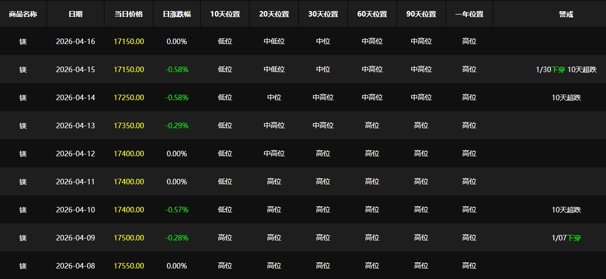 短期内虽存在超跌后技术性修复的可能性,但在需求未见显著回暖、供应保持宽松的大环境下,反弹空间较为有限,仅能视为弱势反抽。当前需着重关注两大关键变量:其一,五一节前下游是否会展开集中备货行动;其二,主产区冶炼企业是否会启动减产、检修计划,这乃是唯一能够扭转短期跌势的核心要素。倘若没有利好因素落地,镁价大概率将延续下行态势。
