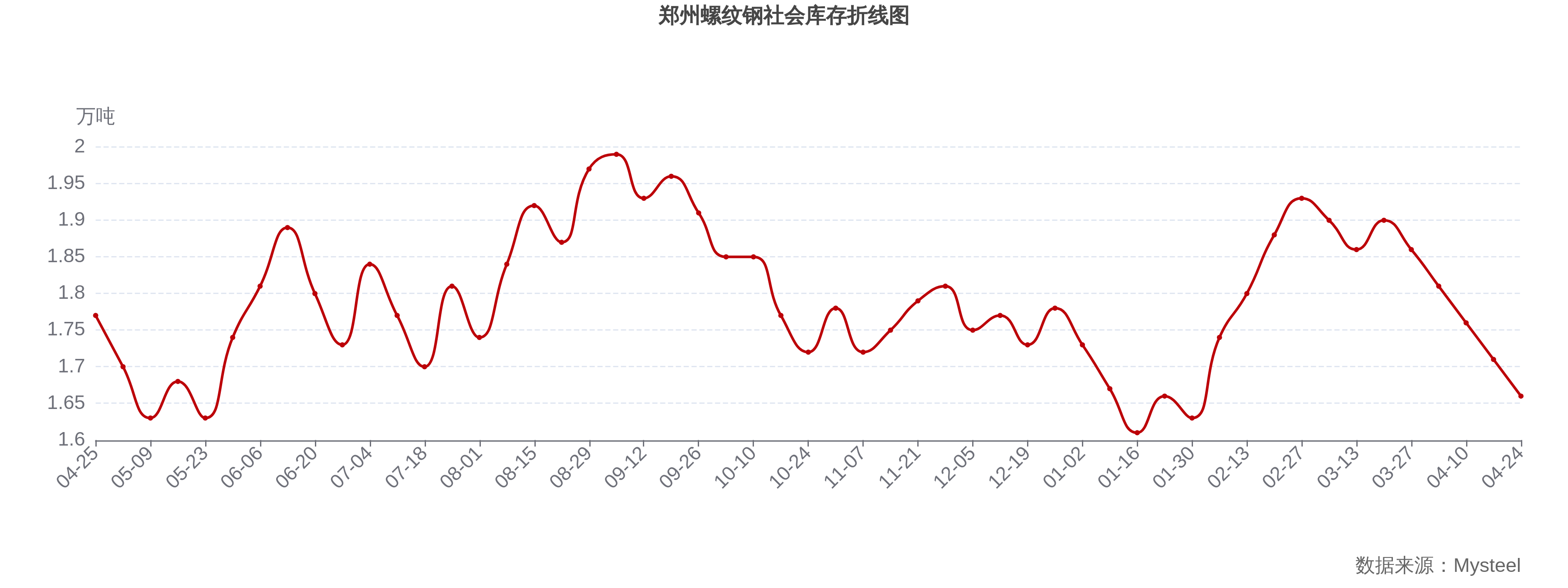 从库存数据来看,郑州地区螺纹钢社会库存持续下降,4月24日库存量为1.66万吨,较前一周减少0.05万吨。这一库存水平较2025年5月16日的转折点(1.68万吨)进一步下降,反映出供需格局的持续改善。