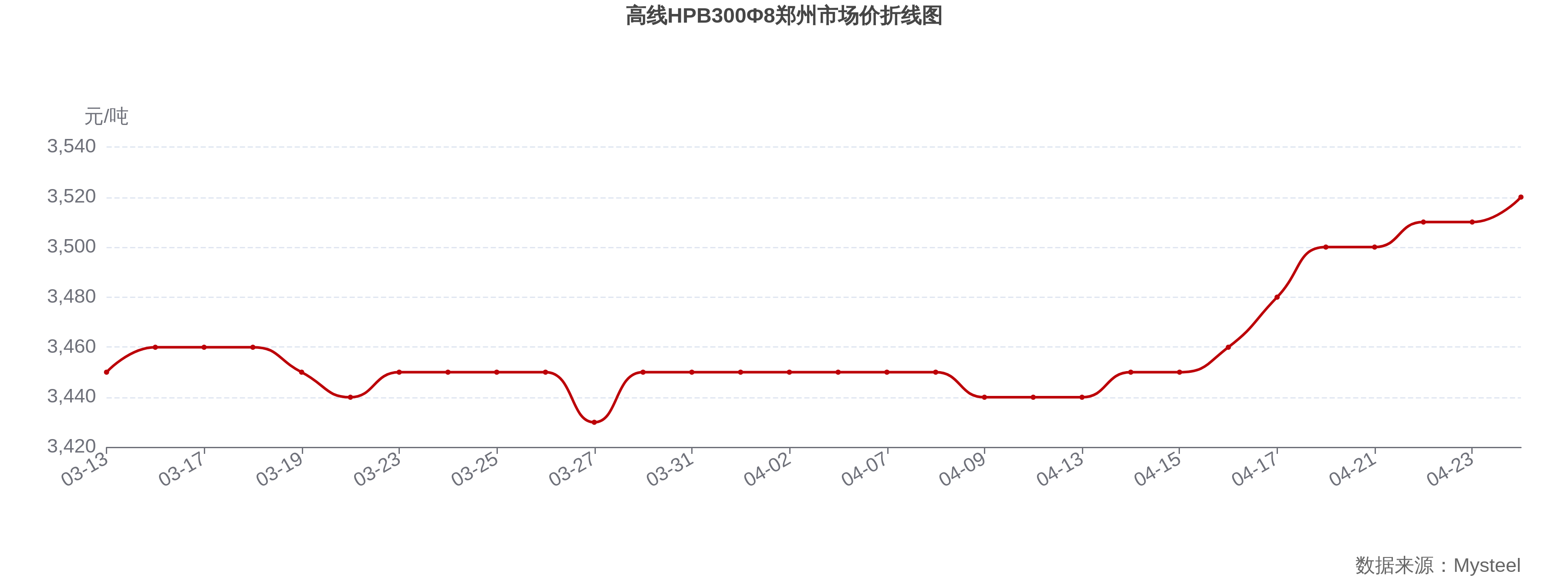 高线品种表现相对活跃,山西建邦HPB300 Φ8高线在郑州市场价格为3520元/吨,呈现明确的上升趋势。根据趋势分析,该品种价格每日约上涨1.66元/吨,当前基准价格水平约为3436元/吨。在2026年4月2日,该高线价格出现转折点,当日价格为3450元/吨,此后维持上涨态势。