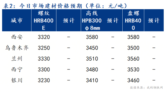 2.表列螺纹钢价格西安、兰州、西宁和银川为HRB400E20mm,乌鲁木齐为HRB400E22mm;盘螺HRB400E材质8-10mm,高线HPB300材质8-10mm。