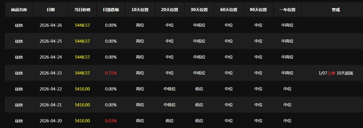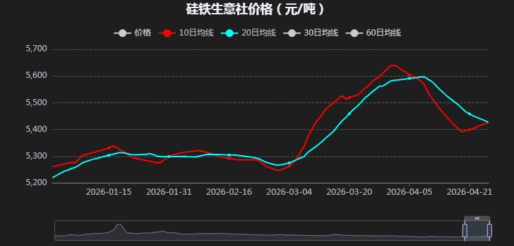 国内硅铁市场价格“前半周横盘蓄势、后半周单边上扬”的走势。周内价格仅在23日出现一次性拉涨,其余交易日保持平稳,上涨节奏集中且明确,结束了前期的横盘状态。据生意社商品行情分析系统数据显示,硅铁(牌号:FeSi75~B;粒度等级/mm:自然块)宁夏地区市场。4月20-22日,价格稳定在5410元/吨,日涨跌幅维持0.00%,市场情绪整体偏观望;4月23日,价格跳涨0.71%至5448元/吨,创周内最大涨幅;4月24日价格稳定在5448元/吨,周内累计涨幅0.71%,价格中枢由5410元/吨上移至5448元/吨,完成周内38元/吨的抬升。