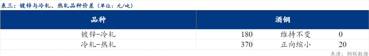 价差方面看,今日兰州与西安市场价差维持不变、与安阳市场价差维持不变、与天津市场价差正向缩小10元/吨、与乌鲁木齐市场价差维持不变。品种价差看,今日镀冷价差维持不变,冷热价差正向缩小20元/吨。