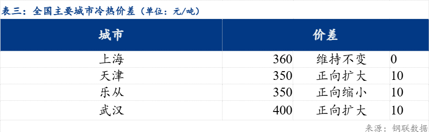 上海冷热价差为360元/吨,天津冷热价差为350元/吨,乐从冷热价差为350元/吨,武汉冷热价差为400元/吨。今日上海冷热价差日环比持平、天津冷热价差日环比扩大10元/吨、乐从冷热价差日环比收窄10元/吨、武汉冷热价差日环比扩大10元/吨。