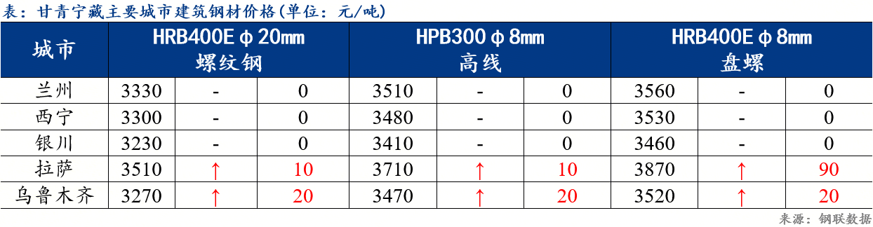 5、本地价格选取钢厂:兰州(酒钢),西宁(酒钢),银川(亚新、申银),拉萨(酒钢),乌鲁木齐(八钢)。