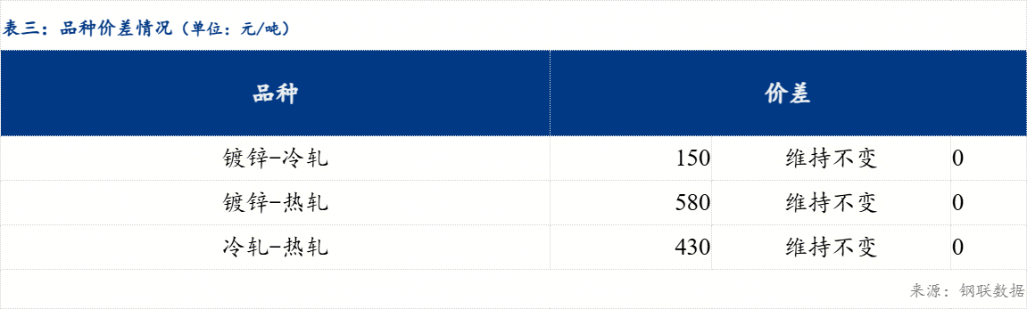 品种价差来看,现镀冷价差为150元/吨,较上一交易日维持不变;镀热价差为580元/吨,较上一交易日维持不变;冷热价差为430元/吨,较上一交易日维持不变。