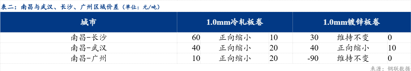 区域价差来看,冷轧品种,南昌-长沙价差为60元/吨,较上一交易日正向缩小10元/吨;南昌-武汉价差为40元/吨,较上一交易日正向缩小20元/吨;南昌-广州价差为10元/吨,较上一交易日正向缩小20元/吨。镀锌品种,南昌-长沙价差为30元/吨,较上一交易日维持不变;南昌-武汉价差为40元/吨,较上一交易日正向缩小10元/吨;南昌-广州价差为-90元/吨,较上一交易日维持不变。