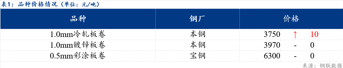 冷轧方面:今日上海冷轧板卷价格上涨10元/吨,1.0mm本钢价格3750元/吨。镀锌方面:今日上海镀锌板卷价格暂稳,1.0mm本钢价格3970元/吨。彩涂方面:今日上海彩涂板卷价格暂稳,0.5mm宝钢(600019)价格6300元/吨。