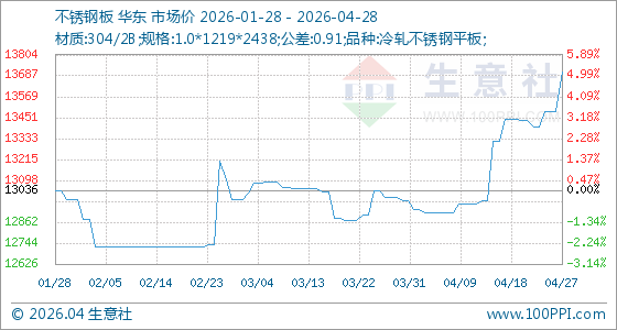 4月28日,生意社不锈钢板基准价为13706.67元/吨,与本月初(12983.33元/吨)相比,上涨了5.57%。
