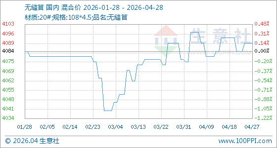 4月28日,生意社无缝管基准价为4090.00元/吨,与本月初(4078.00元/吨)相比,上涨了0.29%。