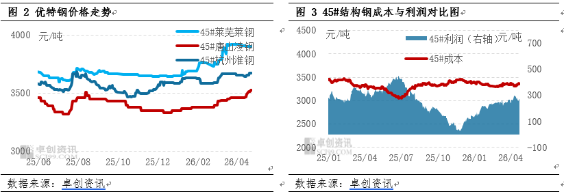 截至4月24日,45#钢月均价3615.25元/吨,较3月小幅上涨,涨幅收窄。2026 年一季度,结构钢市场总产量为1084.51万吨,较去年四季度增加86.88万吨,环比增长明显。钢厂生产积极性较高,部分企业优化品种结构,加大高附加值结构钢产量。进入4月,部分优特钢(884184)企业因产线检修及品种调整,排产量环比微降,供应压力有所缓解。