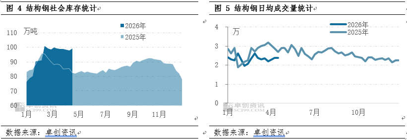 库存方面,社会库存连续两周下降,去库速度稳步提升。卓创资讯(301299)监测数据显示,截至4月24日,结构钢社会库存较3月初略降,市场资源结构趋于紧平衡。分区域看,华东、华南地区库存去化速度快于华北、东北,南方市场供需关系更优。市场成交情况来看,4月整体成交稳中趋弱,日均成交约0.69万吨,环比下滑2.9%,终端需求反馈订单较三月略有下滑,以刚需采购为主,补库较少。