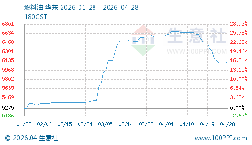 据生意社监测,燃料油04月28日最新价格6112.50元/吨,最近60天上涨12.93%,90天上涨15.88%。