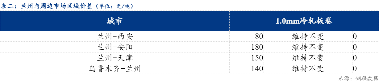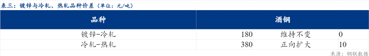 价差方面看,今日兰州与西安市场价差维持不变、与安阳市场价差维持不变、与天津市场价差维持不变、与乌鲁木齐市场价差维持不变。品种价差看,今日镀冷价差维持不变,冷热价差正向扩大10元/吨。