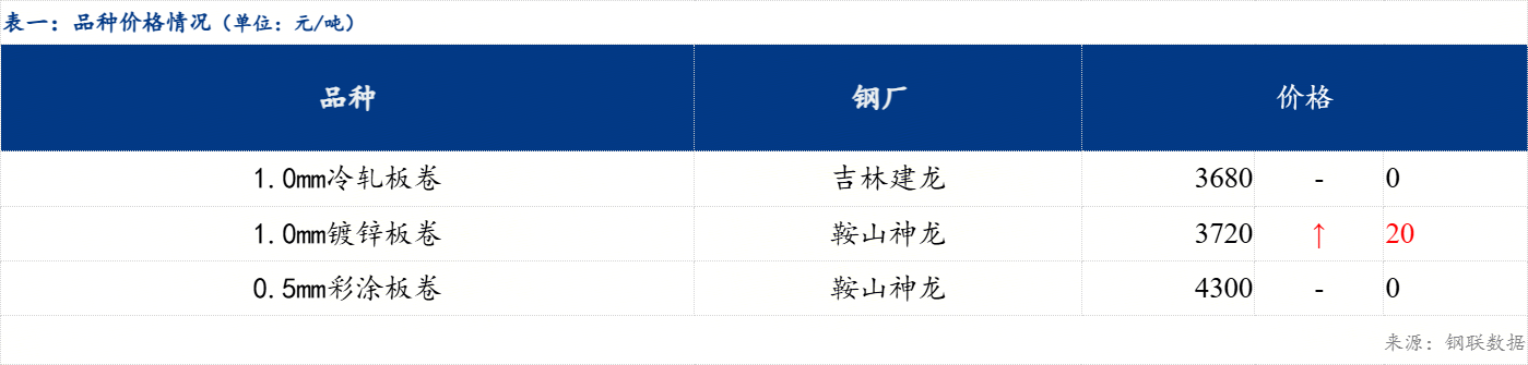 现东北主流市场冷轧镀锌价格持续持稳运行,其中冷轧板卷价格为3680元/吨,镀锌板卷为3720元/吨,较昨日上涨20元/吨, 彩涂板卷为4300元/吨。市场方面,今日热卷期货震荡偏弱运行,市场交投氛围偏差,但是市场镀锌缺货严重,贸易商挺价意愿偏强。库存方面,当前市场库存偏低,出货压力不大,商家多以出货回笼资金为主,多持谨慎观望心态为主。综合来看,预计下一个交易日东北冷轧镀锌板卷价格或将窄幅震荡运行为主。