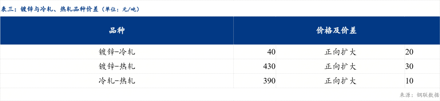 区域价差来看,天津-沈阳冷轧板卷区域价差维持不变,沈阳-哈尔滨冷轧板卷区域价差维持不变;天津-沈阳镀锌板卷区域价差维持不变,沈阳-哈尔滨镀锌板卷区域价差缩小20元/吨。品种价差来看,镀冷品种价差扩大20元/吨;镀热品种价差扩大30元/吨;冷热品种价差扩大10元/吨 。