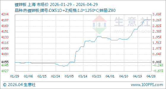 4月29日,生意社镀锌板基准价为4190.00元/吨,与本月初(4130.00元/吨)相比,上涨了1.45%。