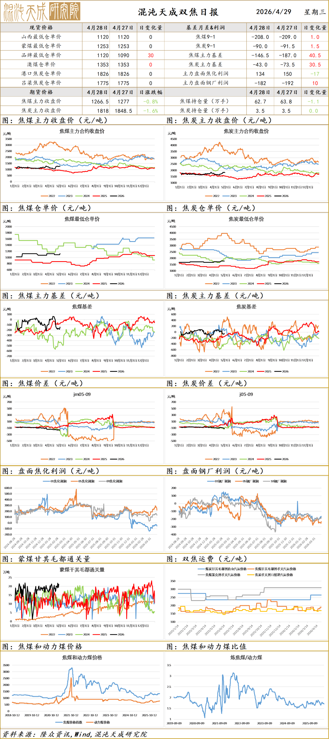 2.中国煤炭(850105)资源网冶金部4月28日重点关注:目前焦企整体盈利状况良好,生产积极性尚可,多维持高位开工。下游钢厂铁水同样高产,刚需旺盛,对原料采购积极性较高,不过近期情况出现分化,华中、华北地区焦企除个别惜售企业外,库存持续低位,多数钢厂原料库存维持在中高位水平。而西北区域部分焦企因前期运输问题被动累库,连带其辐射范围的钢厂到货不足。近期随着物流运输好转,钢厂整体到货较前期有所改善。整体看,焦炭仍处于供需紧平衡阶段,市场博弈加剧。焦煤方面,产地多数煤矿维持正常生产节奏,供应端偏宽松。下游焦钢企业节前补库需求仍存,煤矿签单尚可,少数价格延续小幅上涨,幅度在20-30元/吨。不过多数下游已补库至合理水平,采购以刚需为主,对高价资源接受意愿下降,竞拍成交呈现涨跌互现,坑口煤矿仍有预售订单执行,多无销售压力,报价持稳为主。进口蒙煤方面,期货盘面高位震荡,口岸蒙5资源有限,贸易商报价坚挺,蒙5原煤报价在1120-1130元/吨左右,报还盘差价较大,口岸成交相对清淡。