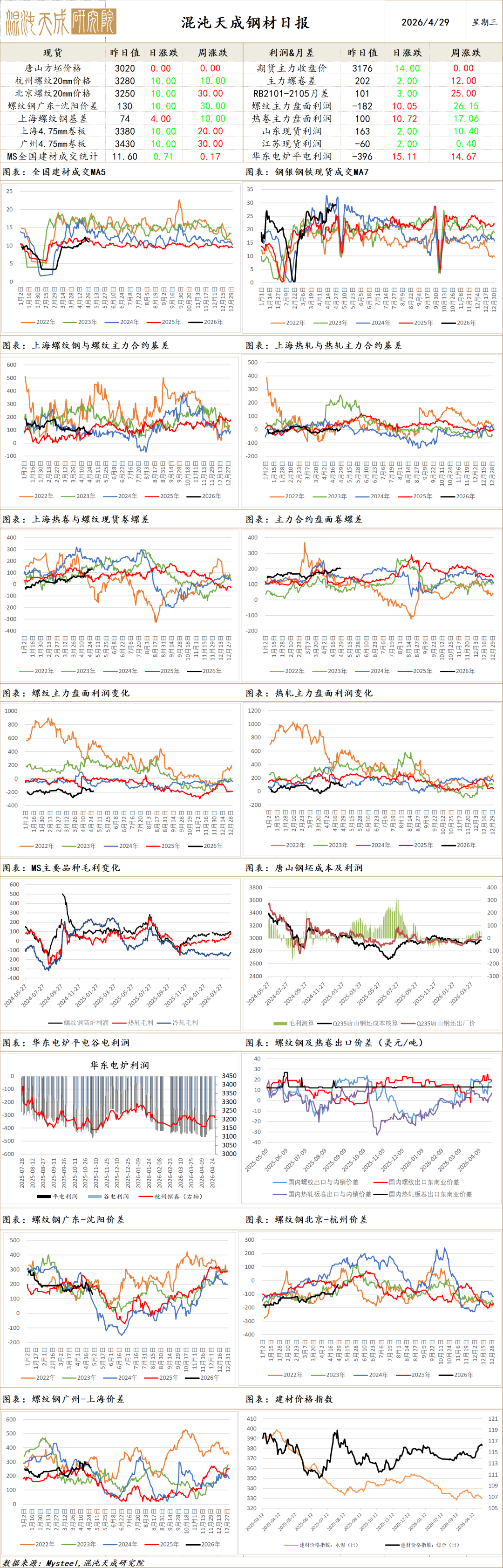 需求端,周一钢银城市钢材库存降幅扩大,各品种钢材库存均有减量。上周机构数据均显示钢材厂库、社库延续下降,且钢材总库存降幅扩大,钢材表需有所增长。另据百年建筑调研,上周全国水泥(884060)出库量274.35万吨,环比上升2%,基建水泥(884060)直供量环比上升2.5%,混凝土搅拌站发运量为130.03万方,环比增加7.67%,整体建筑下游需求延续小幅回升。海外方面,尽管市场对美以伊战事有所脱敏,但当前中东局势仍面临较大不确定性,近日双方谈判前景又面临困境,外盘油价有所走强,贵金属(881169)和有色表现趋弱。国内方面,一季度钢铁(850106)行业是41个工业行业中唯一的亏损行业,且产业内各企业盈利分化严重,机械工业领域利润也多有下降,显示当前传统制造业盈利压力依然较大,反内卷任重道远,昨日政治局会议再提深入整治“内卷式”竞争,整体会议要求坚持稳中求进工作总基调。进出口方面,昨日欧洲、独联体钢价有所上涨,国外其它地区钢价持稳,目前国内外冷热卷价差有个别走扩,国内钢材仍有一定出口空间。