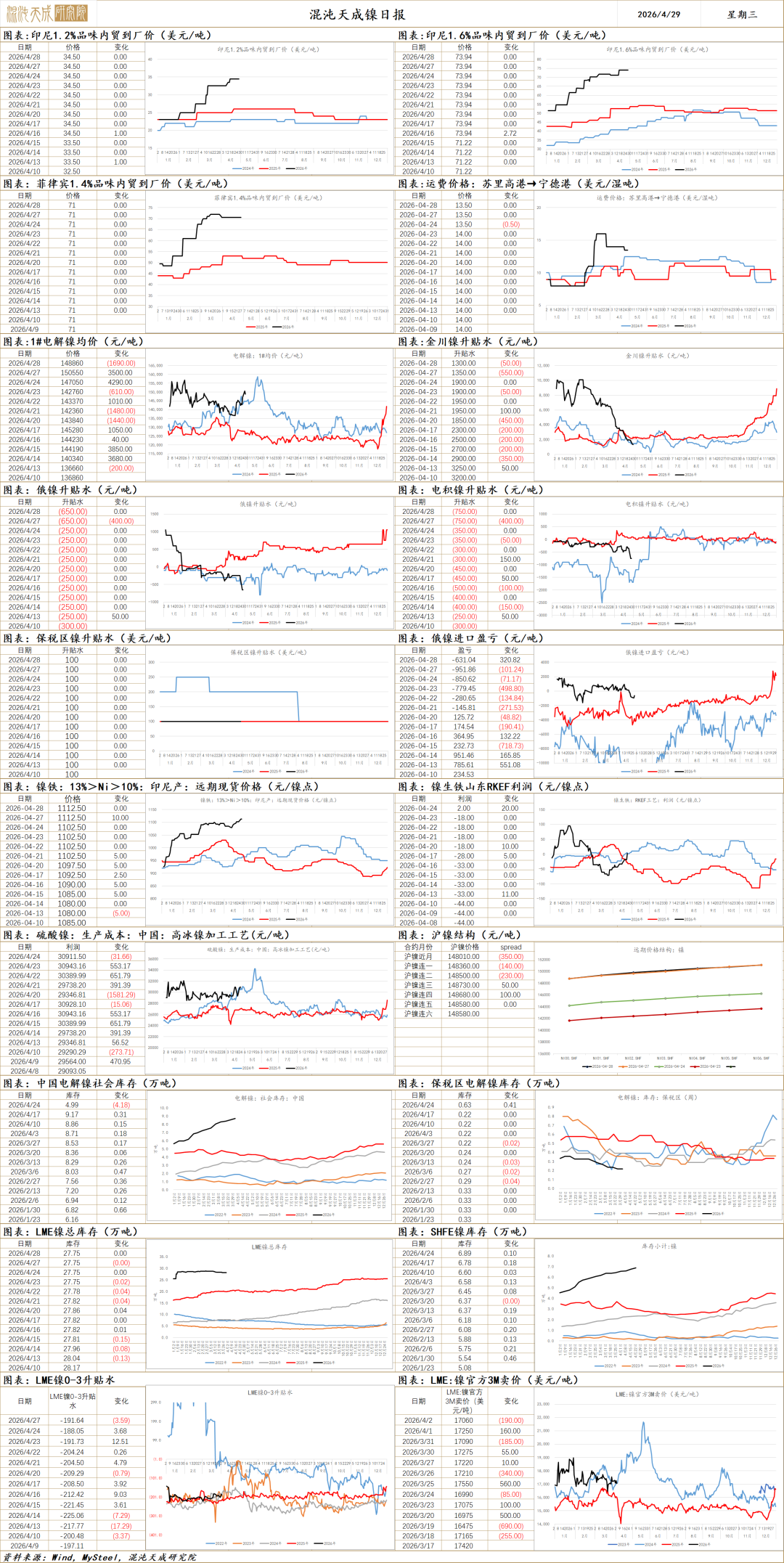 供应端,华友钴业(603799)公告称,公司印尼子公司华飞镍钴因硫磺价格大幅上涨及产线高负荷运行,自2026年5月1日起对部分产线临时停产检修,预计影响约50%产量。由于硫磺供应偏紧,价格紧张,预计后续印尼湿法产线陆续会都有减产动作,5月MHP产量预计下降约30%。短期精炼镍环节供应压力或随之缓解。