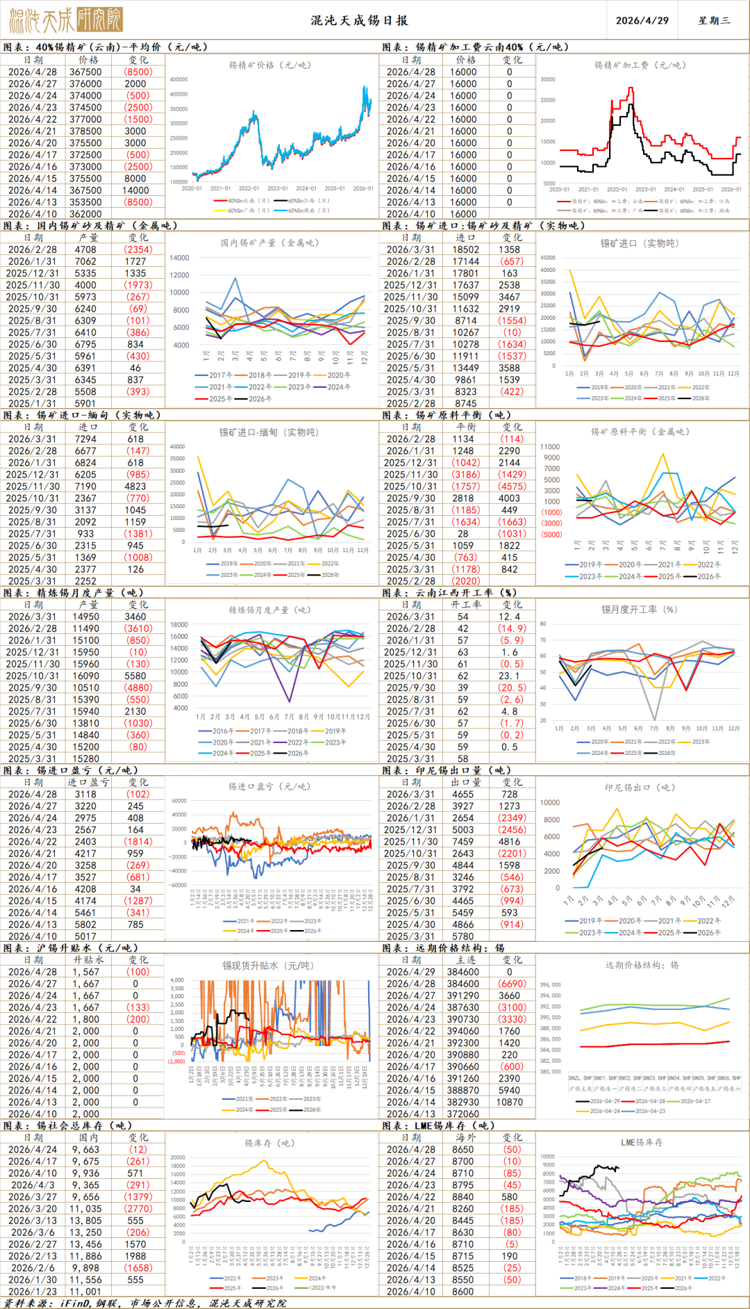 1.【锡价震荡调整 成交部分尚可】近期主要受到宏观情绪面影响,价格高位震荡,今日价格跌势扩大,锡市加大出货力度,部分让利较大的商家出货尚可;消费(883434)面上,用家采购力度稍显迟滞,高位观望不少,且随着短线供应有所增加,倘若需求未有快速跟进,市场仍或担忧库存增长压力。跟盘不动,听闻小牌对5月升水1000-升水1500元/吨左右,云字头对5月升水1500-升水2000元/吨附近,云锡对5月升水2000-升水2500元/吨左右。(SHMET)