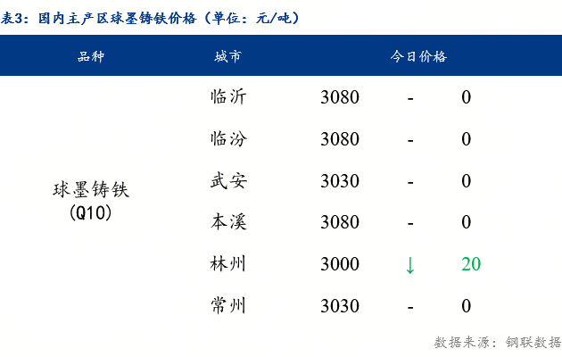 29日全国生铁价格主稳个调,市场成交一般。其中10城炼钢生铁L8-L10均价2667元/吨,较上一交易日价格持稳;10城铸造生铁Z18均价3048元/吨,较上一交易日价格持稳;8城球墨铸铁Q10均价3040元/吨,较上一交易日价格下调3元/吨。