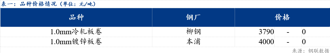 今日市场冷轧板卷主流资源价格3790元/吨,较上一交易日持平,镀锌板卷主流资源价格4000元/吨,较上一交易日价格持平。