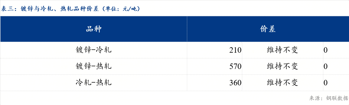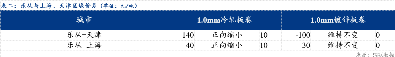 今日冷轧板卷乐从与天津价差较上一交易日收窄10元/吨,乐从与上海价差较上一交易日收窄10元/吨;镀锌板卷乐从与天津价差较上一交易日持平,与上海价差较上一交易日持平。品种价差方面,镀冷价差较上一交易日持平,镀热价差较上一交易日持平,冷热价差较上一交易日持平。